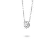 No jewelry collection is complete without a classic halo necklace. Set in 14k white gold, with a ⁸⁄₉ carat center stone surrounded by lay paving over, it is the perfect accessory for any outfit