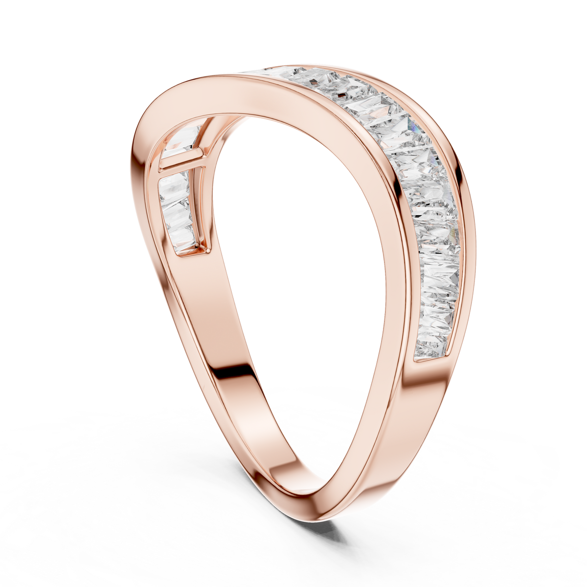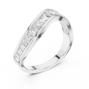 This beautifully contoured white gold ring showcases a refined row of baguette-cut diamonds, expertly channel-set for a sleek and secure finish. The elegant curve of the band is designed to complement engagement rings or stand alone as a sophisticated statement piece. The clean lines and modern profile highlight the brilliance of the diamonds, creating a timeless look with contemporary appeal. Ideal for weddings, anniversaries, or special occasions, this ring offers both luxury and lasting elegance.