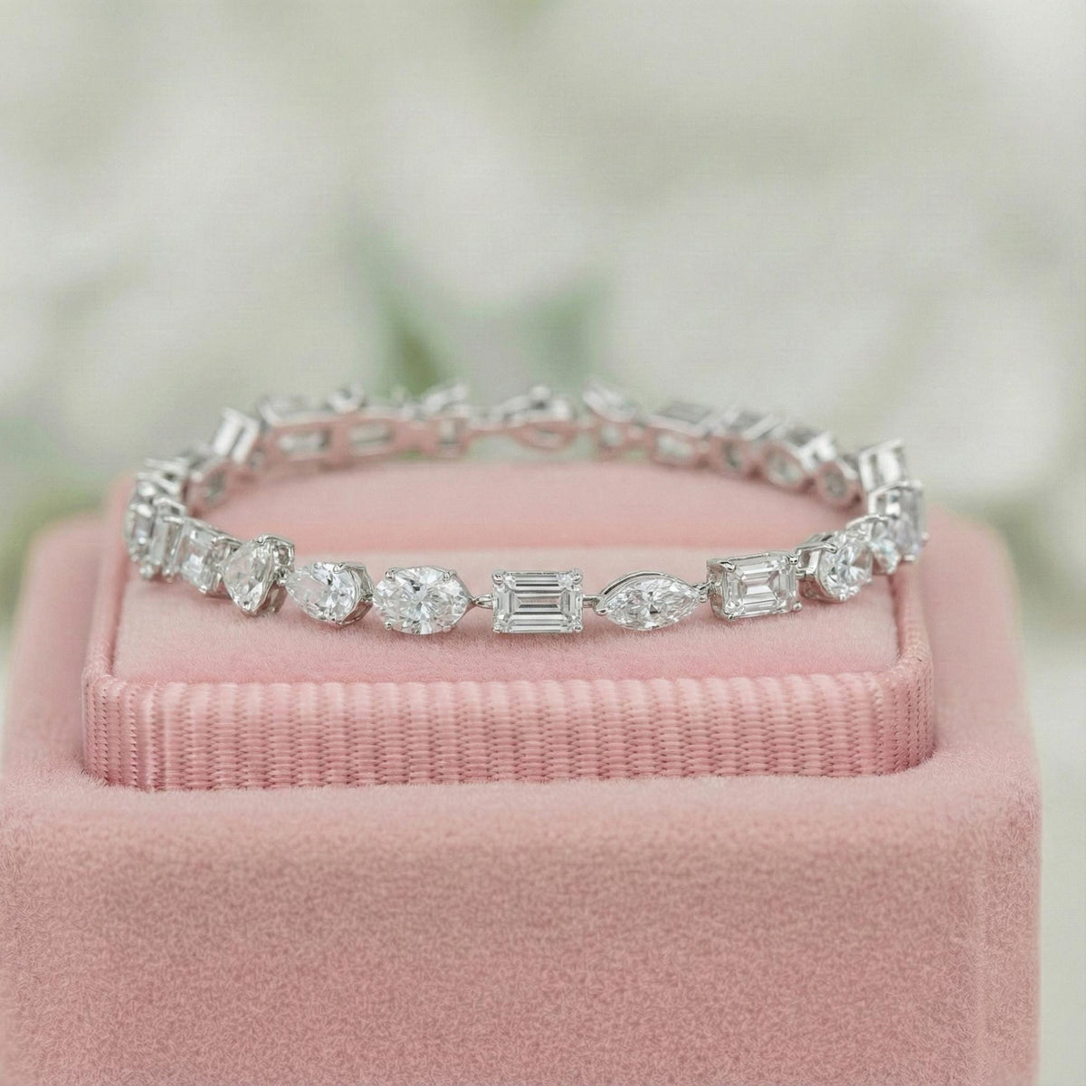 Step into the spotlight with this extraordinary multi-shape diamond bracelet. A breathtaking masterpiece of modern luxury, this bracelet moves away from the traditional, offering a captivating dance of light and form with its unique collection of fancy-cut diamonds. Each stone is meticulously set to create an unforgettable statement of elegance and sophistication.