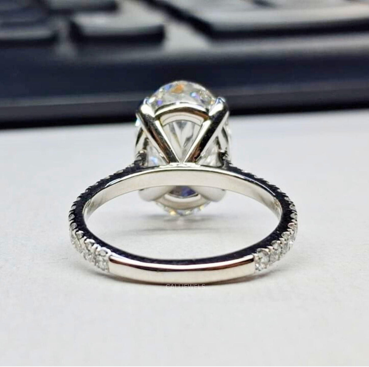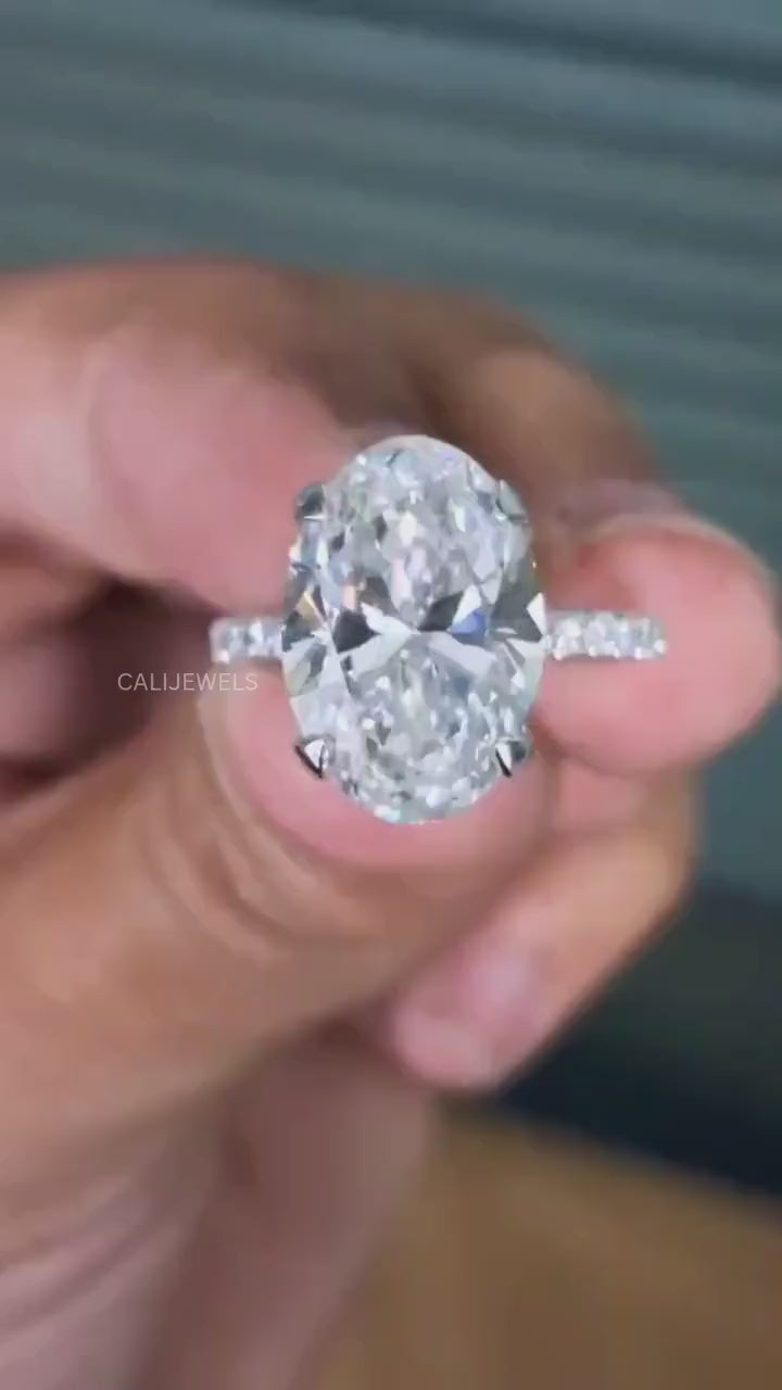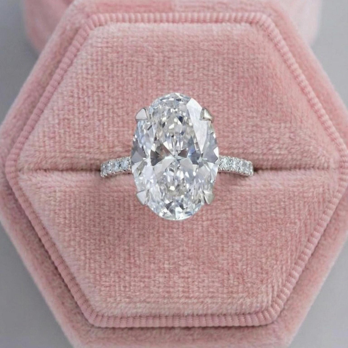 Elevate your proposal with this breath-taking 5 Carat Oval Cut Engagement Ring. A true masterpiece of modern design and timeless elegance, this ring is crafted for the woman who appreciates sophistication and show-stopping brilliance. The pave band extends three-quarters of the way around the shank for continuous sparkle and comfort.