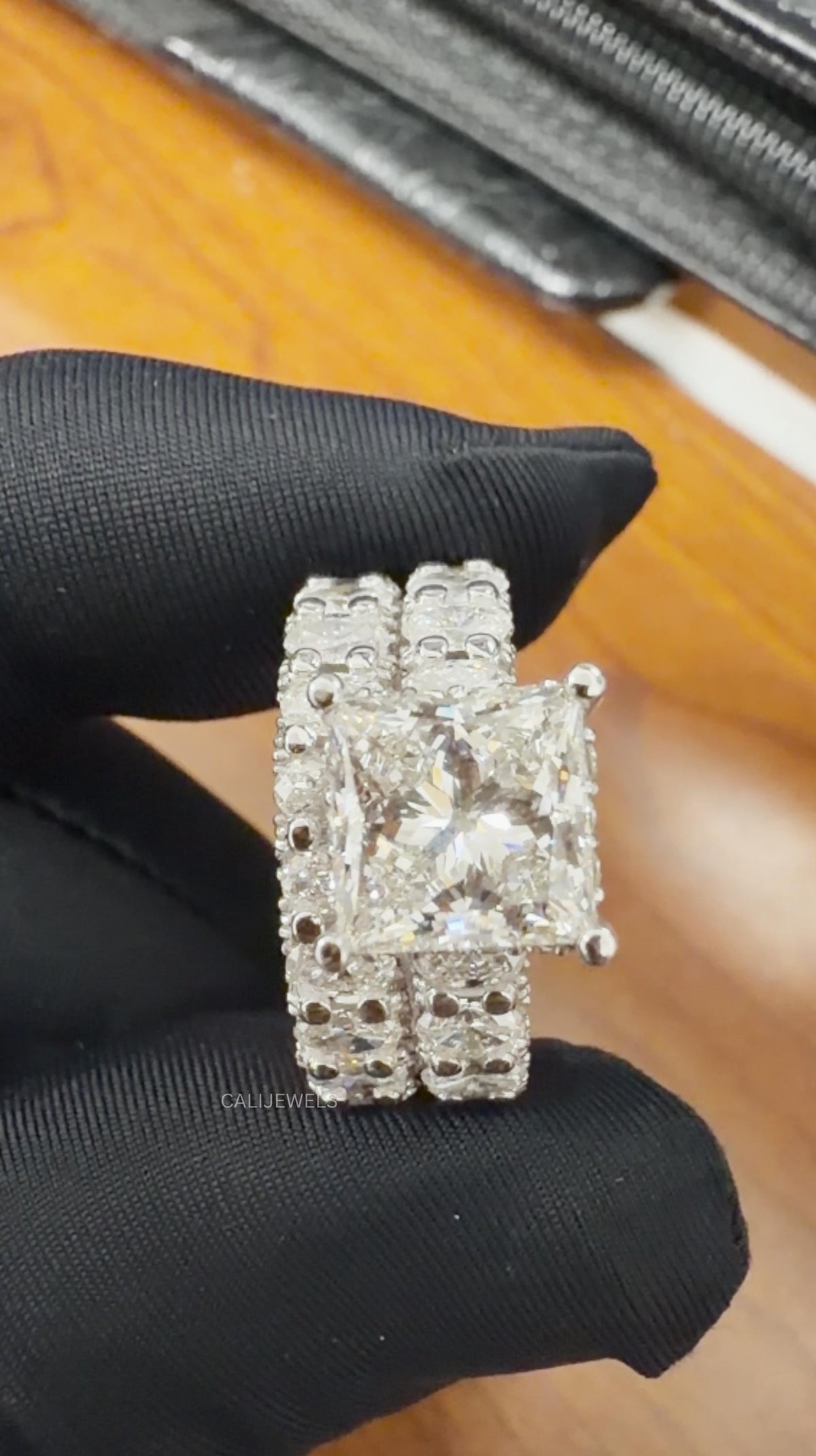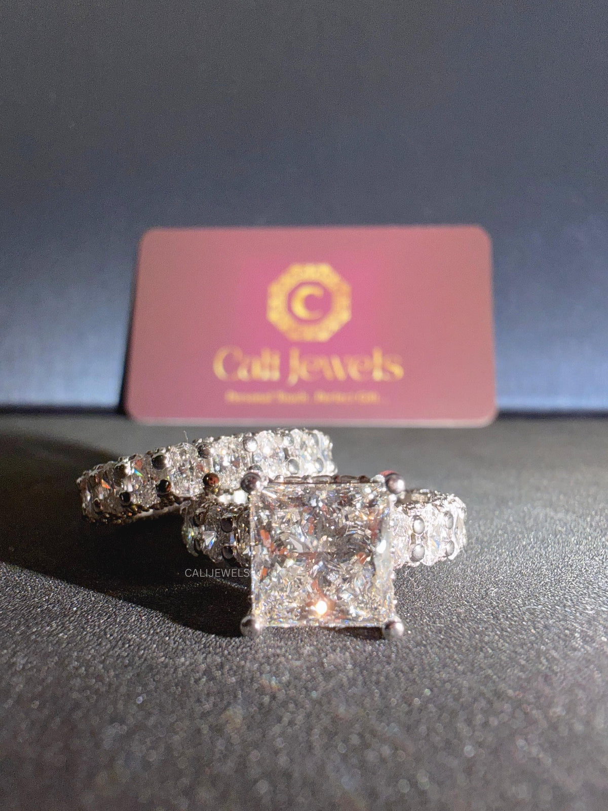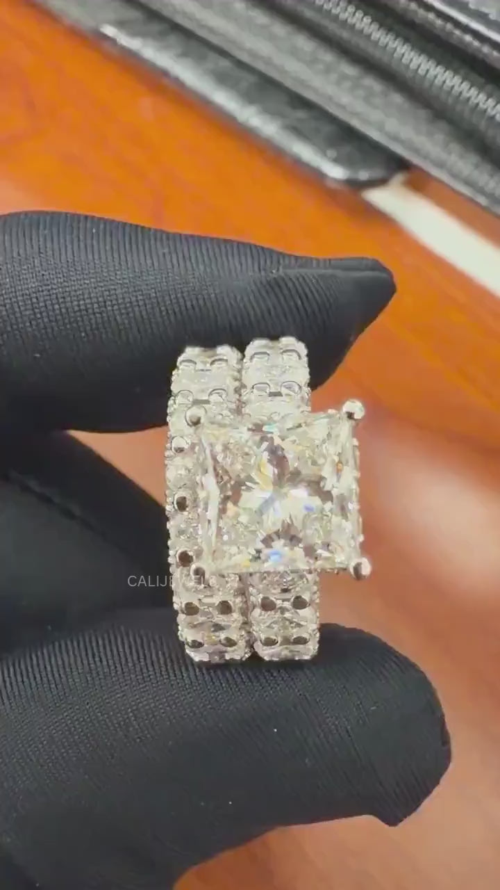 Redefine luxury with this spectacular lab-grown diamond bridal set. Designed for those who adore maximum sparkle, this set features an extravagantly wide "bubble" cluster design that dazzles from every conceivable angle. The engagement ring showcases a stunning, high-clarity Princess Cut lab-grown diamond as its centrepiece, set securely with four prongs to maximize its fire and brilliance. The true show-stopper is the setting. Both the engagement ring and the perfectly coordinating matching band are crafted as wide eternity rings. They feature a unique "bubble" or "cluster" setting, where dozens of multi-sized Round Brilliant lab diamonds are meticulously set together. This technique creates an uninterrupted, multi-dimensional river of light with a bold, high-fashion look. This bridal set is a masterpiece of craftsmanship, perfect for a milestone anniversary or an unforgettable wedding day.