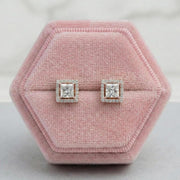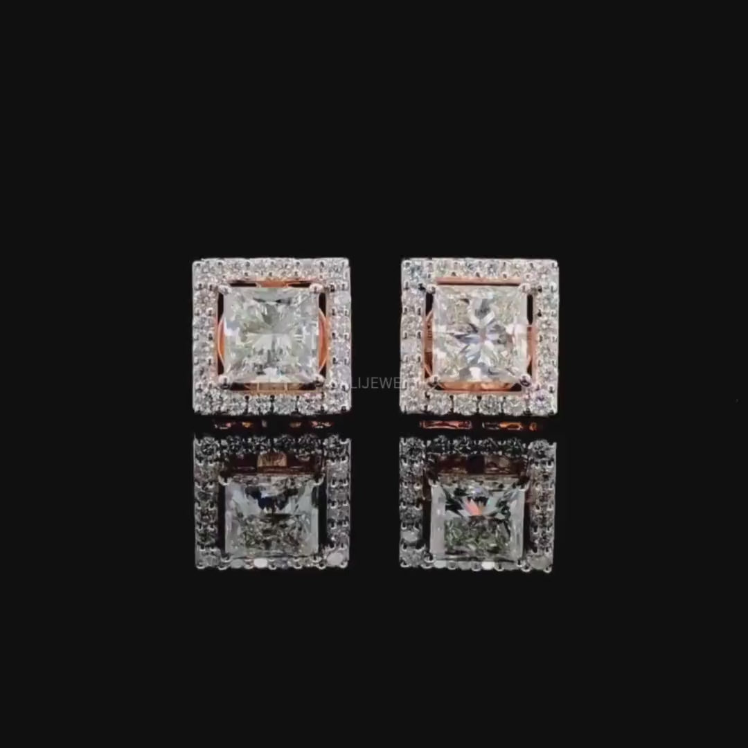 Elevate your everyday look or add a touch of timeless sparkle to a special occasion with these exquisite lab diamond stud earrings. Featuring brilliant princess-cut lab-grown diamonds enveloped in a shimmering halo of smaller accent stones, all set in luxurious rose gold, these earrings are a true statement of elegance and ethical luxury.