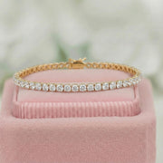 A continuous, breath-taking line of brilliant round-cut lab-grown diamonds wraps your wrist in unparalleled sparkle. Each stone is meticulously set in a classic 4-prong setting, crafted from lustrous 14k Yellow Gold / 18k Yellow Gold / Platinum to create an unbroken river of light. This bracelet is the perfect blend of modern ethics and timeless design, making it the ultimate accessory for any occasion.