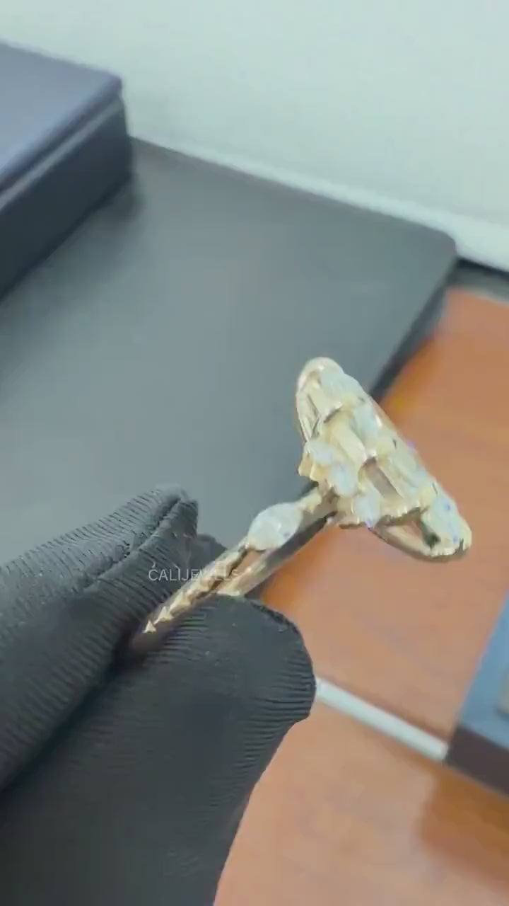 Make a celestial statement with this breath-taking marquise-cut lab diamond ring. Inspired by vintage starburst designs, this unique engagement ring is a true showstopper, blending timeless glamour with modern, sustainable luxury. At the heart of the ring, a brilliant marquise-cut lab-grown diamond shines, celebrated for its elegant, elongated shape that flatters the hand. This stunning centre stone is encircled by a dazzling halo of shimmering round and baguette-cut diamonds, creating a celestial "starburst" effect that catches the light from every angle.